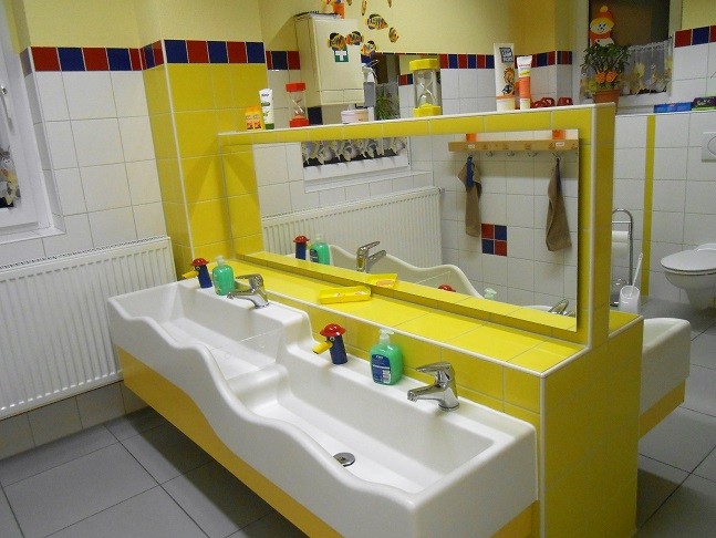 Des Weiteren sind drei moderne Sanitärbereiche und zwei Garderoben für die Kinder vorhanden.